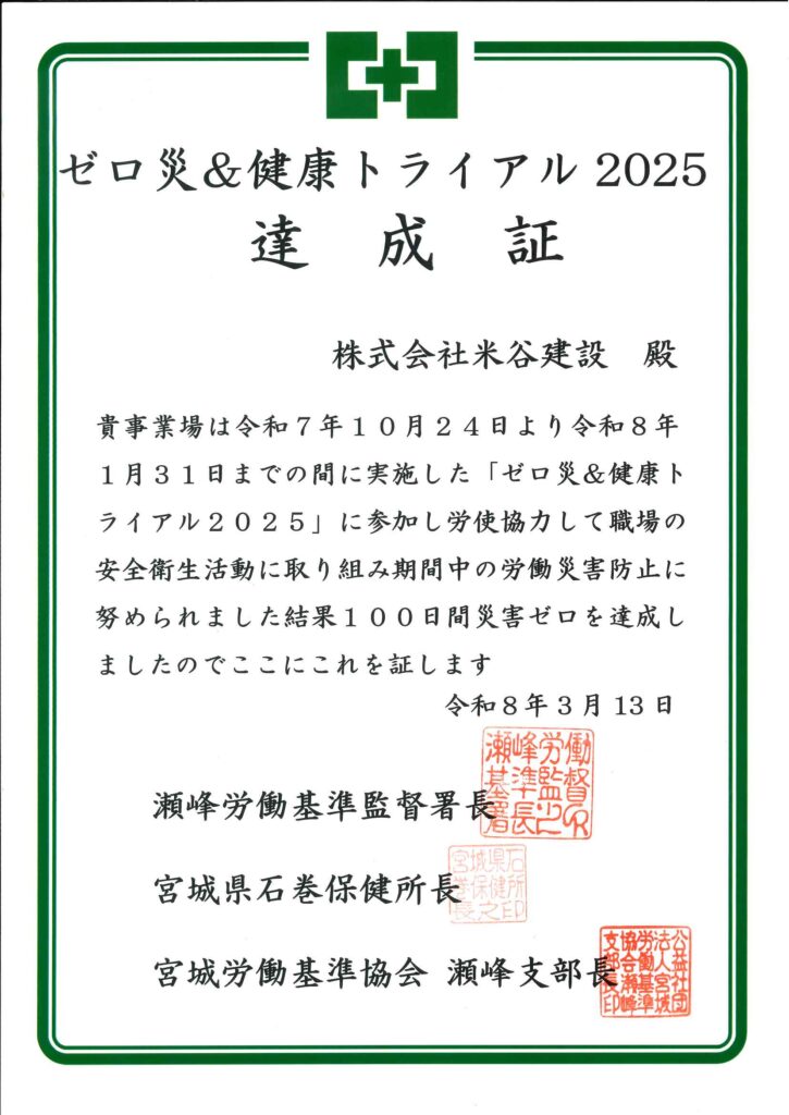 米谷建設は、「ゼロ災&健康トライアル2025」において、無事故・無災害および健康づくりの取り組みが評価され、「達成証」をいただきました。