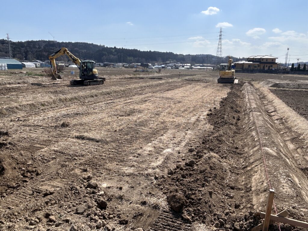 地域の農業生産性を高めるため、米谷建設創立以来、お世話になっているお客様の水田の拡張工事を行いました。